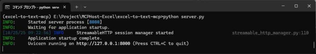 先ずはMCPサーバーを起動するため、MCPサーバーのプロジェクトフォルダで下記を実行します。