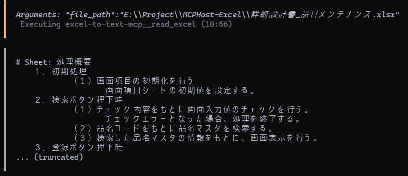 MCPHostディレクトリの「.mcphost.json」に、作成した「excel-to-text-mcp」を追加しています。