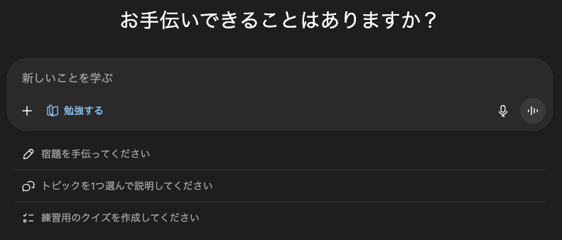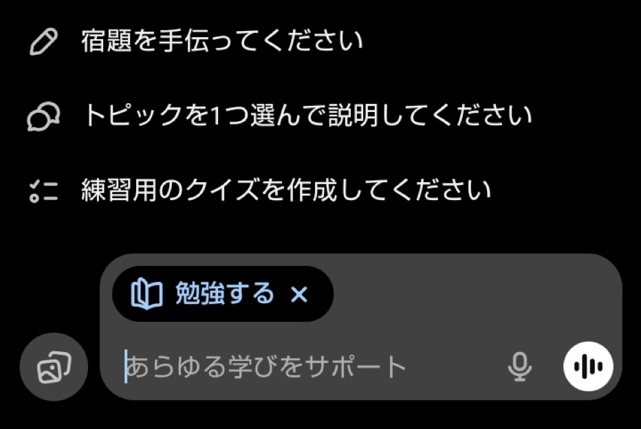 さらに、「あらゆる学びをサポート」を選ぶとチャット欄に「勉強する」と表示されます・・・。