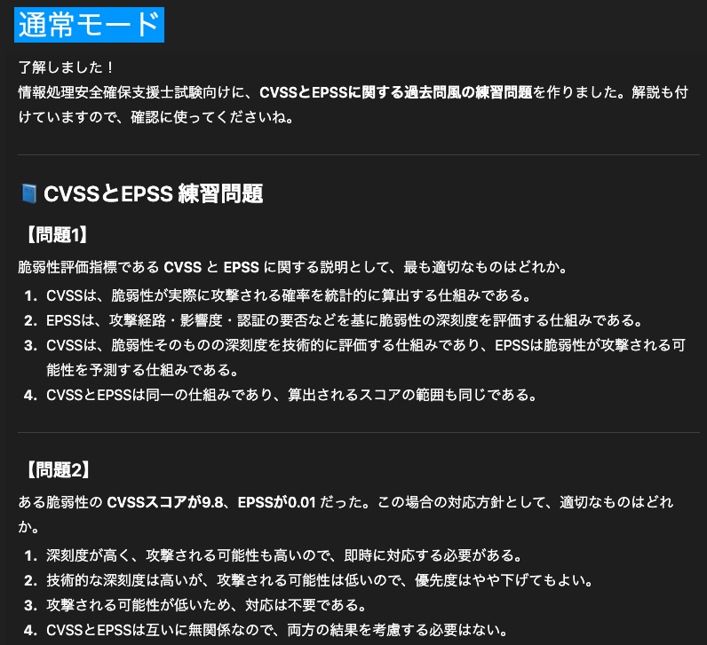 どちらのモードでも「練習問題を作成しますか?」と聞かれたので、お願いしてみます。